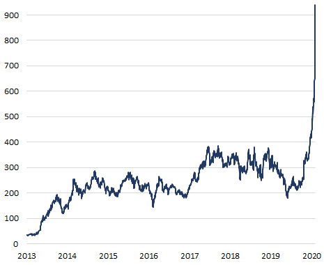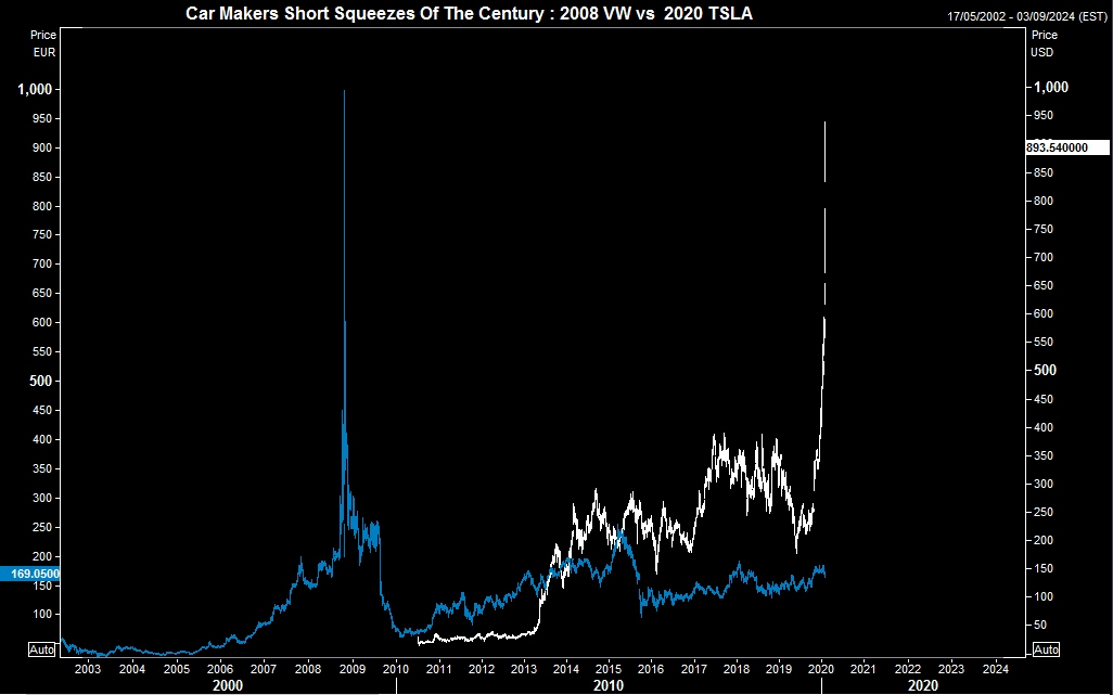 We mentioned yesterday that Tesla ($TSLA) was going parabolic. Turns out that buying the share when the price was already vertical was actually a good idea. “If it keeps going, it will pierce the afterlife” writes a colleague – it went up another $100 yesterday.