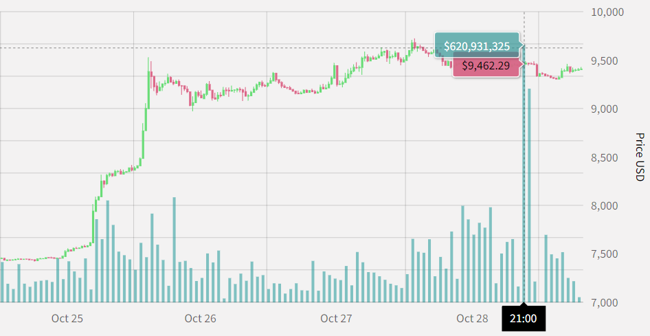The Bitcoin market has been an interesting place to visit recently. Last week, the market rallied almost $2,000 in 12 hours for seemingly no reason. Transactions over the Bitcoin network, the blockchain, weren’t huge around the time: the largest activity during that rally was a quarter billion dollars being transferred over half an hour. That’s all changed now though: over a billion bucks were transacted over the network between 9 and 10 pm last night.