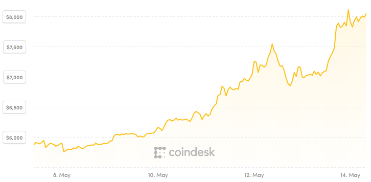 In just a week bitcoin is up more than $2,000, with half of that occurring in one cathartic push higher yesterday.