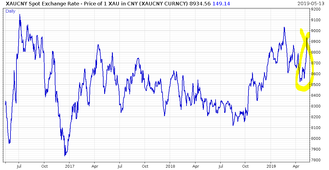 With markets taking risk off the table, gold has risen in dollars, pounds, and euros, but especially in yuan, as the Chinese seek to protect their wealth: