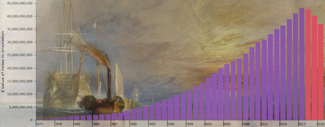 The bear market in 20-pound notes, click to enlarge. Data sourced from the Bank of England